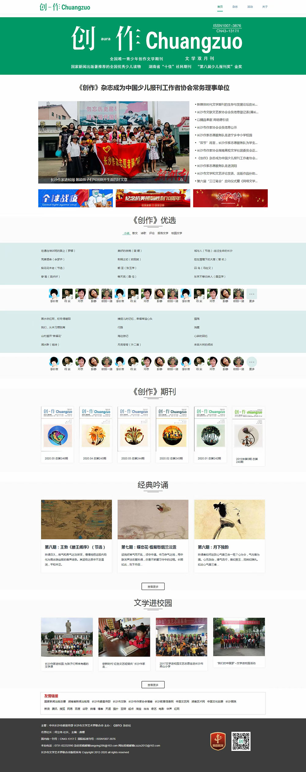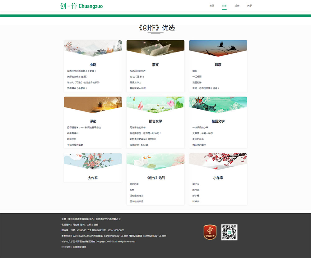 《創(chuàng)作》雜志原名《新創(chuàng)作》,1982年創(chuàng)刊。是一家在國內(nèi)外公開發(fā)行的大型文學(xué)期刊,由中共長沙市委宣傳部主管,長沙市文聯(lián)主辦,擁有國際標(biāo)準(zhǔn)刊號( ISSN 1007-3876)、國內(nèi)統(tǒng)一刊號(CN43-1317/I)。2015年被國家新聞出版署評為“全國優(yōu)秀少兒報刊”?2016年榮獲湖南省“十佳”社科期刊?2018年榮獲第四屆“湖湘優(yōu)秀出版物獎”榮譽獎?由長沙市作協(xié)、《創(chuàng)作》雜志社組成的作家志愿服務(wù)隊送書籍雜志和文學(xué)講座到19所鄉(xiāng)村中小學(xué),被長沙市文明委評為2018年度長沙市優(yōu) 秀文化志愿服務(wù)團隊。