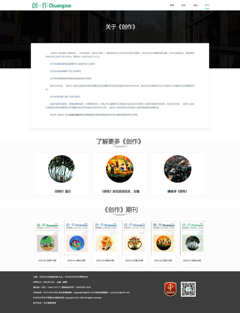 《創(chuàng)作》雜志原名《新創(chuàng)作》,1982年創(chuàng)刊。是一家在國內(nèi)外公開發(fā)行的大型文學(xué)期刊,由中共長沙市委宣傳部主管,長沙市文聯(lián)主辦,擁有國際標(biāo)準(zhǔn)刊號( ISSN 1007-3876)、國內(nèi)統(tǒng)一刊號(CN43-1317/I)。2015年被國家新聞出版署評為“全國優(yōu)秀少兒報刊”?2016年榮獲湖南省“十佳”社科期刊?2018年榮獲第四屆“湖湘優(yōu)秀出版物獎”榮譽獎?由長沙市作協(xié)、《創(chuàng)作》雜志社組成的作家志愿服務(wù)隊送書籍雜志和文學(xué)講座到19所鄉(xiāng)村中小學(xué),被長沙市文明委評為2018年度長沙市優(yōu) 秀文化志愿服務(wù)團隊。